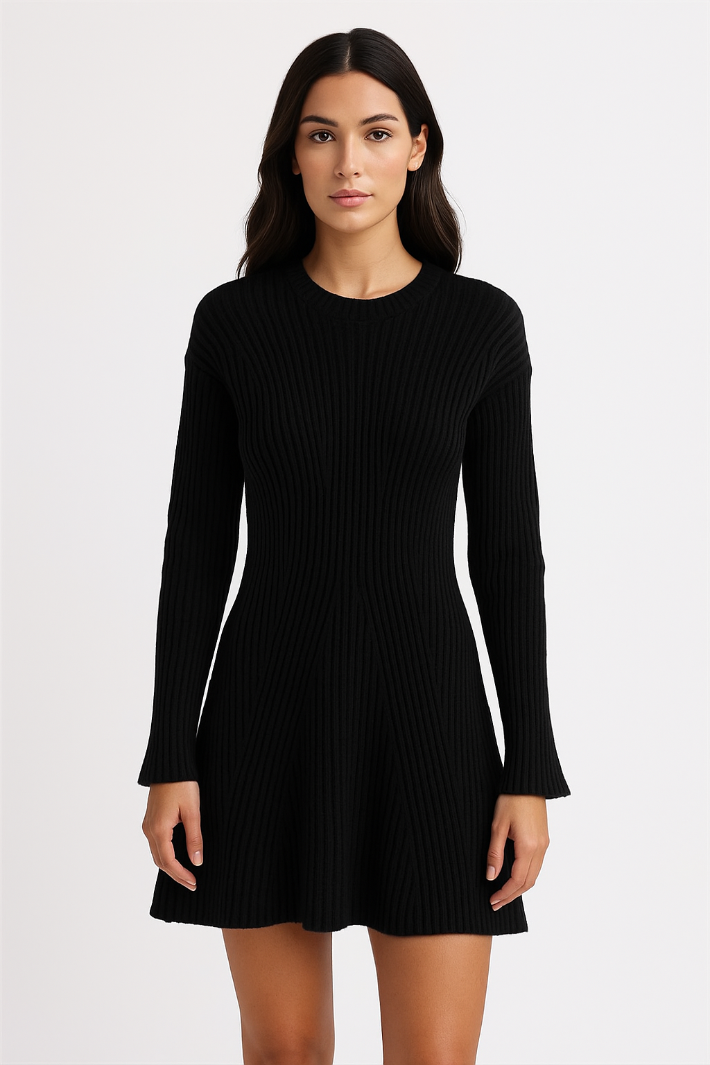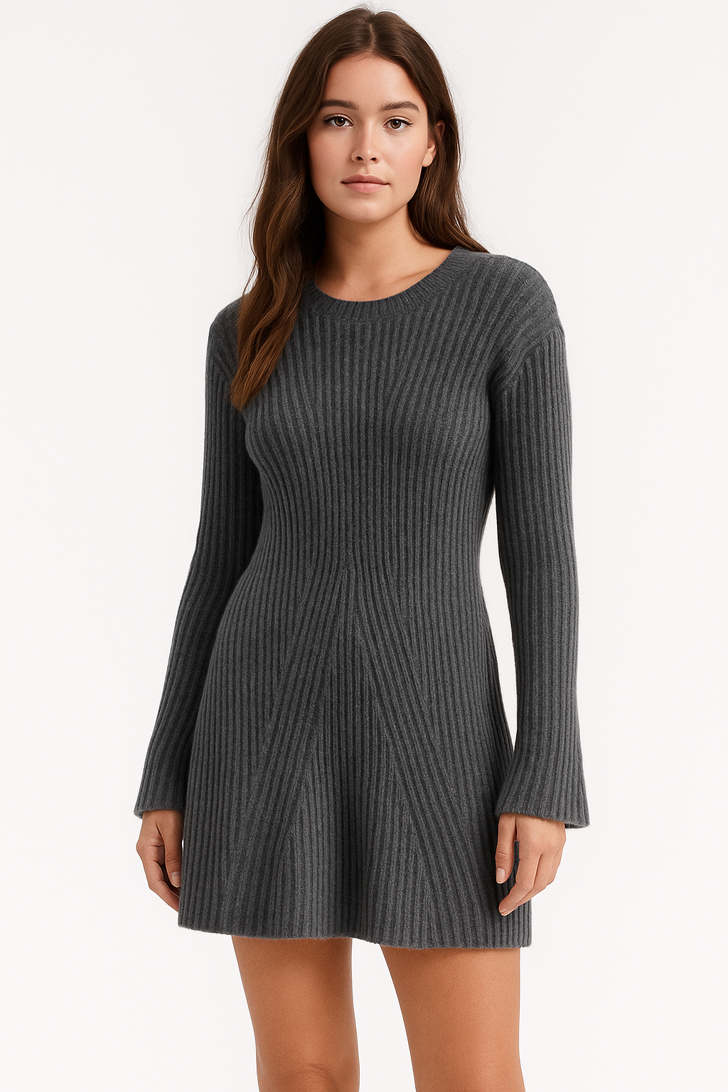 Rebrasti uzorak vizualno izdužuje figuru, a blago zvonasti rukavi i A-kroja donji dio daju modernu, sofisticiranu notu. Idealna je za jesen i zimu — nosi se uz čizme, tenisice ili visoke potpetice.