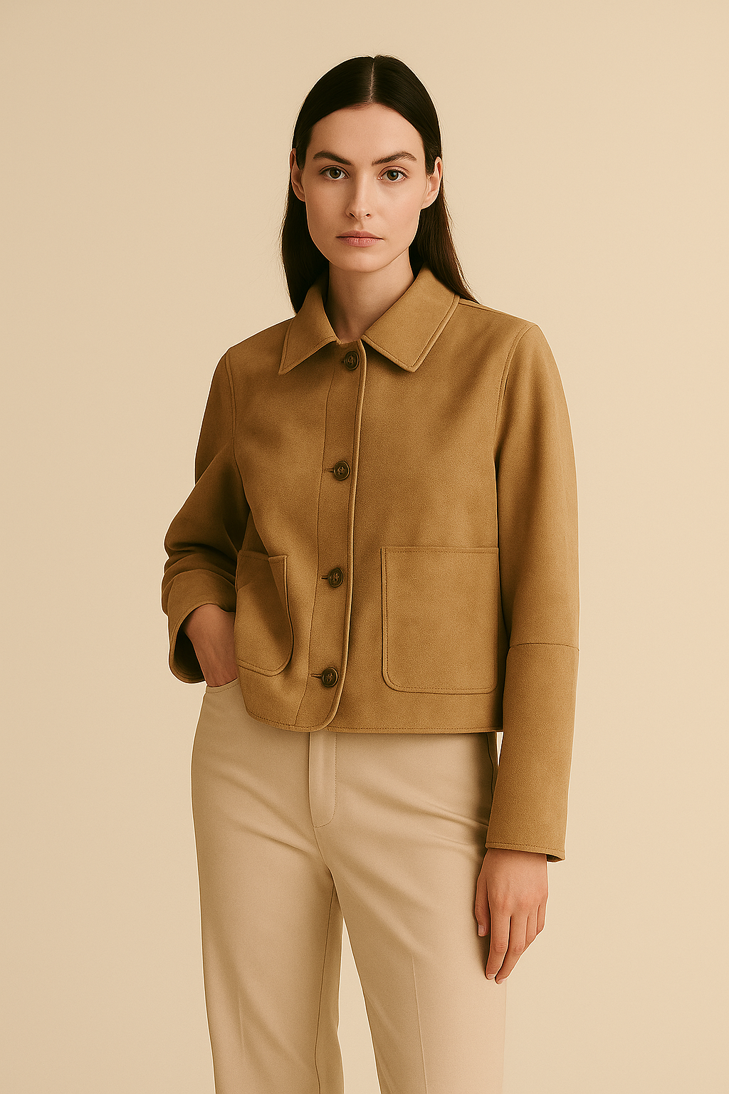 Minimalistički kroj – kratki kroj s elegantnim ovratnikom i gumbima.